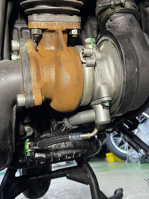 当店に修理で入庫する750ターボ。タービンオイルホースのカシメ部からのオイル漏れが経年劣化からのようで最近増えてります。